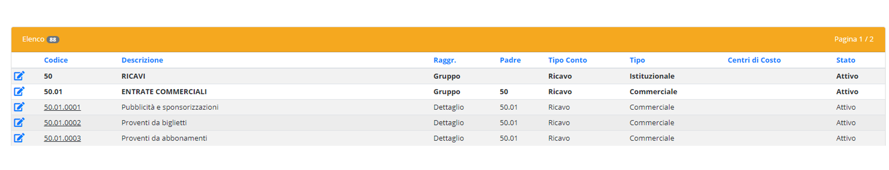 Per modificare o cancellare una voce di conto basterà cliccare sulla corrispondente icona a forma di matita presente ad inizio di ogni riga. L'unico campo che non si può modificare è quello relativo al codice.