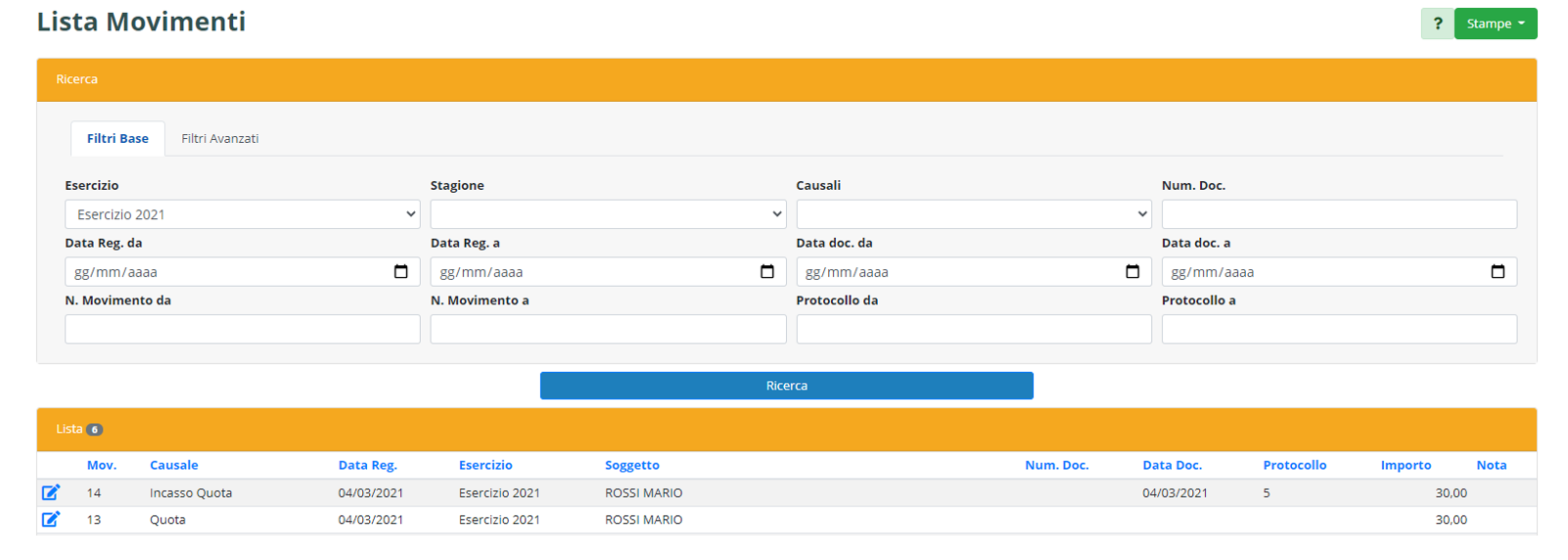 I movimenti presenti a video possono essere estrapolati in Excel e pdf tramite il tasto "Stampe" presente in alto a destra.