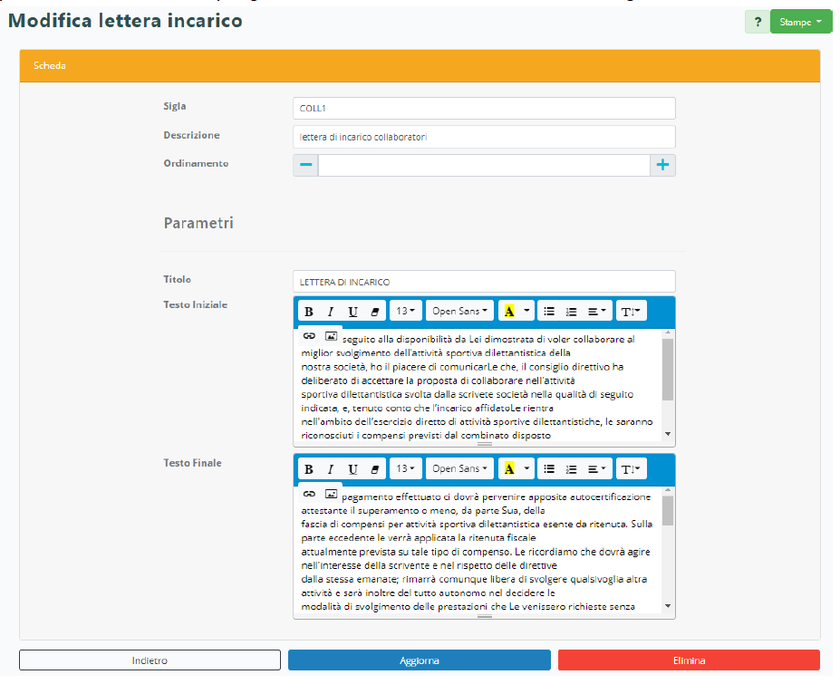 Al pari del Tipo compenso è possibile parametrizzare in Compensi>Parametri>Tipo Lettera di Incarico, i modelli di lettera di incarico che potranno essere utilizzati per generare le lettere di incarico intestate ai singoli collaboratori.