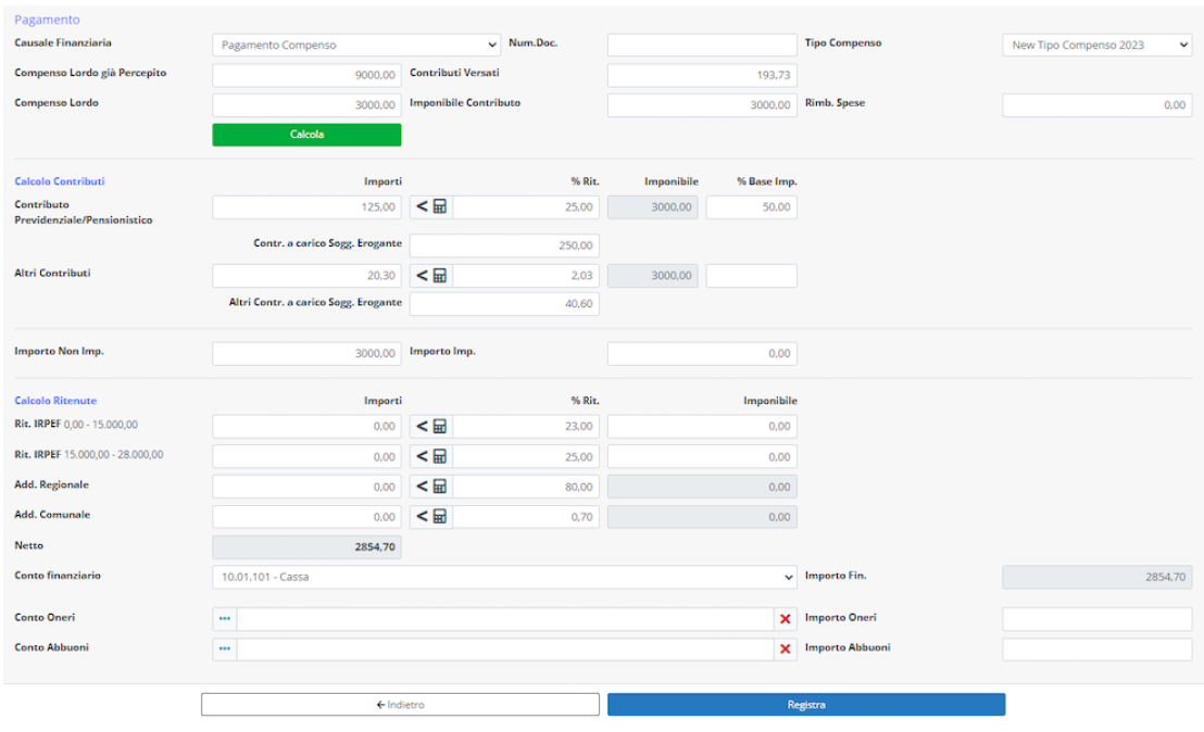 La registrazione finanziaria consentirà di calcolare il compenso al netto di contributi (previdenziali e altri contributi minori) e di ritenute, in riferimento alle soglie di esenzione contributiva / fiscale previste per legge.