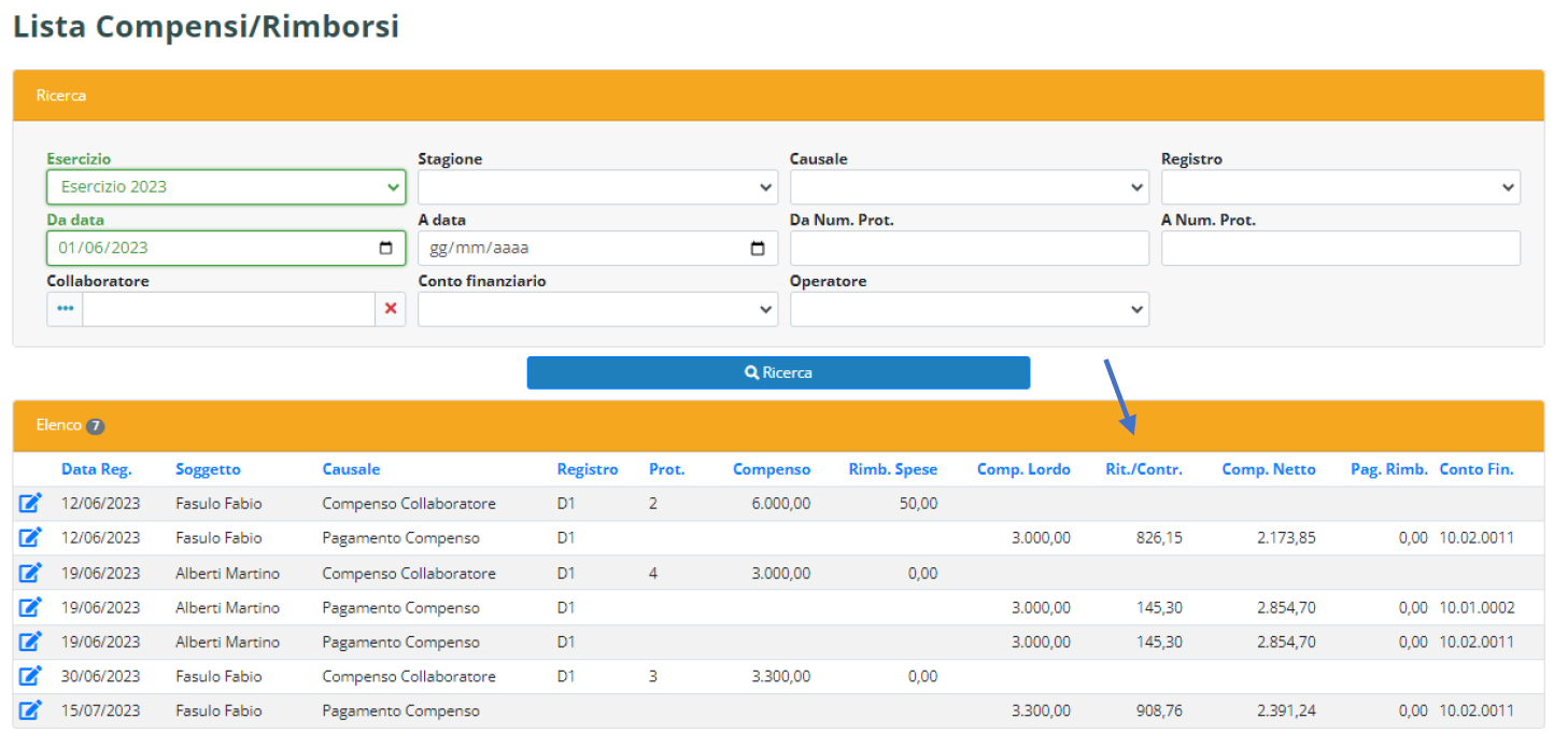 Nella colonna Rit./Contr. verranno visualizzati gli importi totali conteggiati in sede di registrazione.