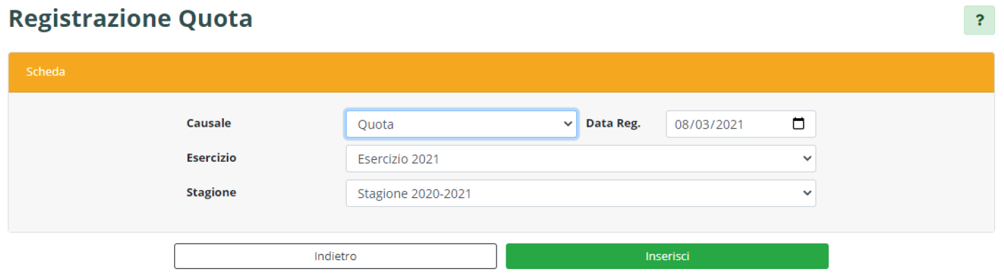 Questa funzione viene utilizzata per la registrazione della quota incassata dai singoli soci/partecipanti. Per prima cosa sarà necessario selezionare la causale contabile adatta.