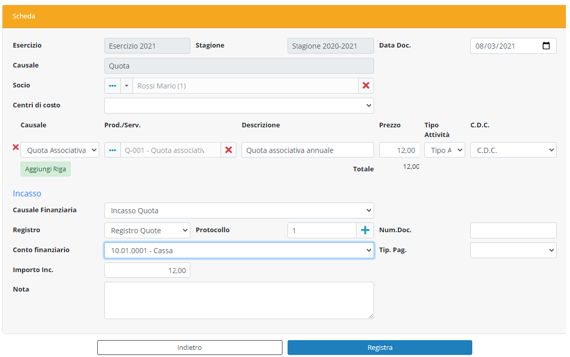 Campo obbligatorio, indicante il socio/partecipante di cui si sta registrando la quota. Causale di riga Deve essere obbligatoriamente indicata almeno una causale tra quelle proposte (quota associativa, quota corso, altre quote).