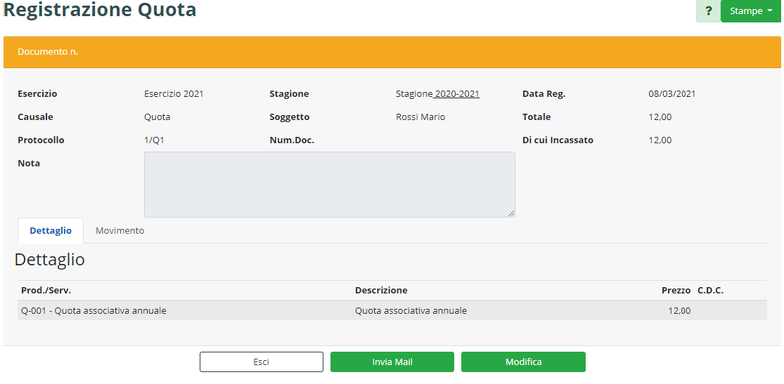Questa causale vi consente di registrare la restituzione di una quota, andando inoltre a stornare il ricavo dal relativo conto. Anche in questo caso avrete la possibilità di registrare il movimento finanziario in modo contestuale alla registrazione economica.