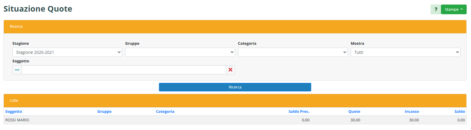 Questa funzionalità è particolarmente interessante in quanto permette di avere sotto controllo in qualsiasi movimento la situazione relativa all’Incasso delle Quote.