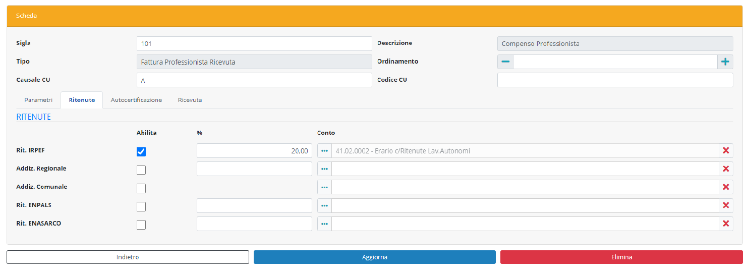 Il valore della percentuale della ritenuta di acconto IRPEF è attualmente del 20% e deve essere inserito direttamente in questa scheda.