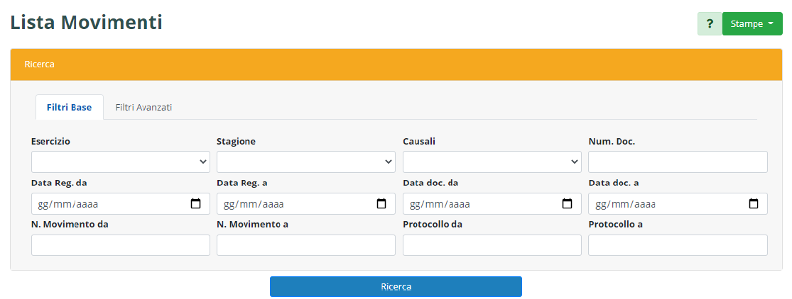 Attraverso il pulsante “Stampe” in alto è possibile estrarre la lista dei movimenti in formato .xls o .pdf.