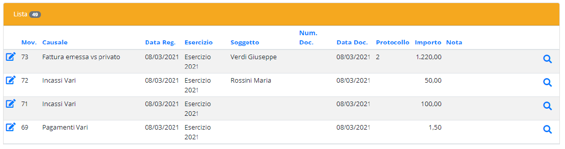 Dall’elenco è possibile entrate in ogni singolo movimento attraverso l’icona a inizio riga e modificarlo, mentre con l’icona della lente di ingrandimento è possibile visualizzare la scrittura contabile.