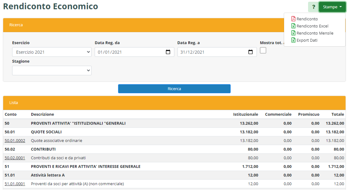 Attraverso il pulsante "Stampe" in alto a destra è possibile esportare il rendiconto economico sia in formato .pdf che .xls, inoltre dà la possibilità di esportare un rendiconto per mese.