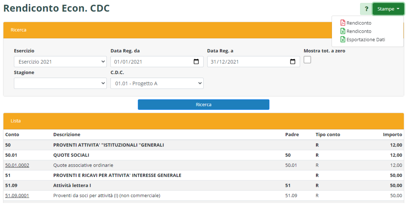Questa funzione permette di stampare il rendiconto economico dopo aver compilato i dati richiesti per Centro di Costo.
