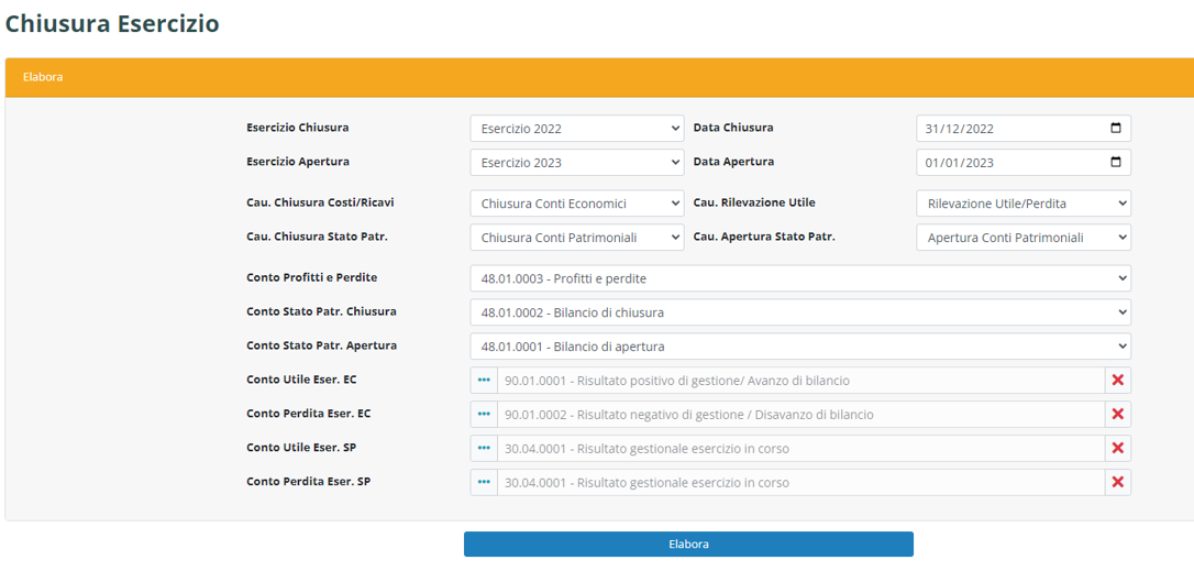 Attraverso questa funzione è possibile generare automaticamente le scritture di Chiusura e Riapertura tra un Esercizio e l'altro, compilando come di seguito i vari campi: