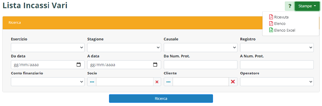 In alto sulla destra il pulsante “Stampe” permette di elaborare tutte le ricevute in maniera massiva, piuttosto che l’elenco delle stesse in formato .pdf o .xls.