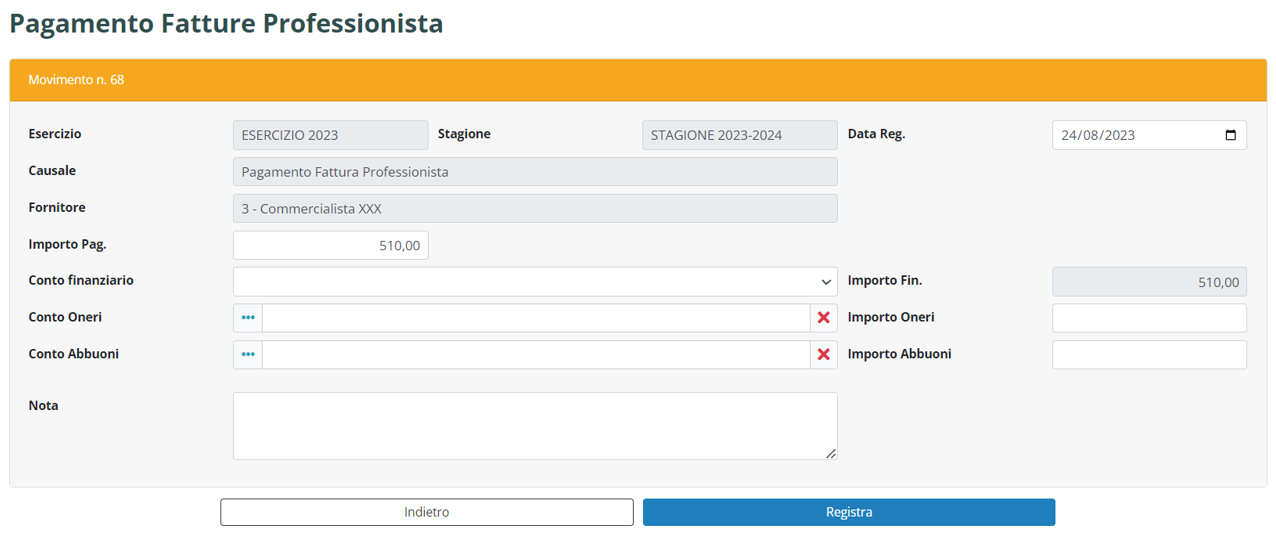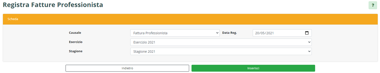 Selezionando una causale economica, ad esempio “Fattura professionista”, verrà visualizzata la seguente maschera: