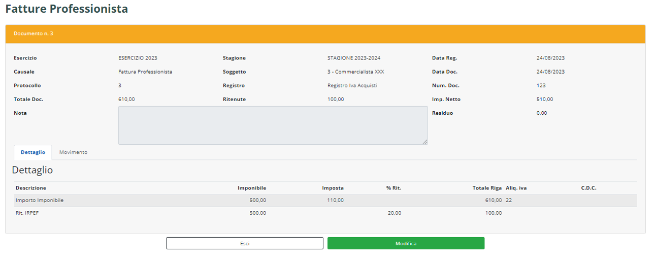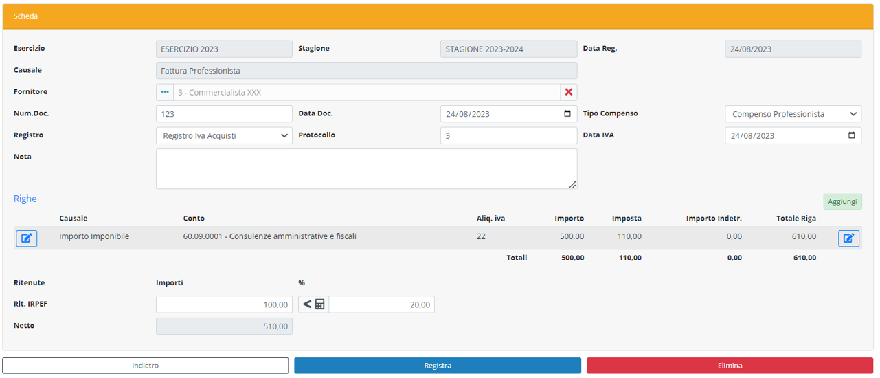 Per la registrazione economica si sceglierà ad es. la causale “Fattura professionista”.