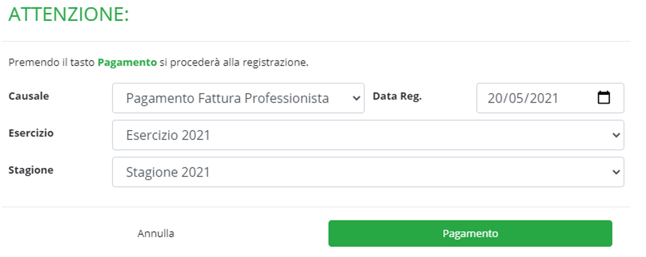 - Se il pagamento avviene in maniera consecutiva alla registrazione della fattura (vedi maschera sopra) è necessario premere sul pulsante “Pagamento”;