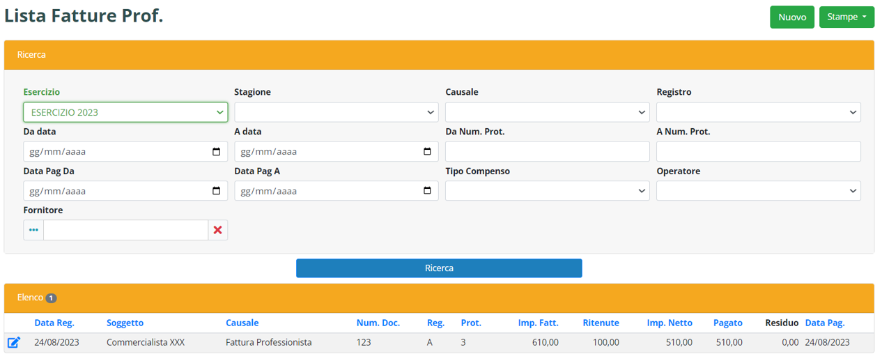 La funzione “Lista Fatture Prof.” permette di avere un elenco puntuale delle registrazioni effettuate sia economiche che finanziarie.