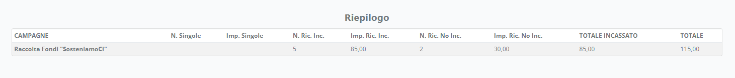 Al termine della pagina è presente una tabella di Riepilogo raggruppato per singola campagna donazione, che indica:
