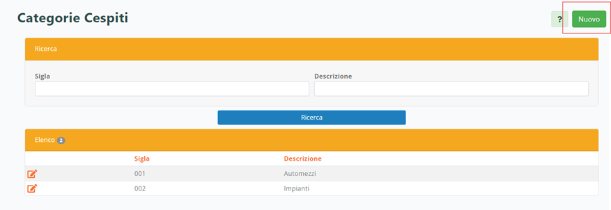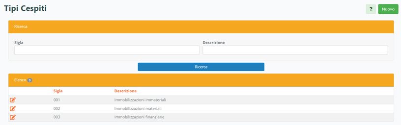 Per Tipi Cespiti si intendono le Immobilizzazioni materiali, immateriali ed eventualmente se presenti anche quelle finanziarie. Di conseguenza, è necessario inserirle cliccando su “Nuovo” in alto a destra: