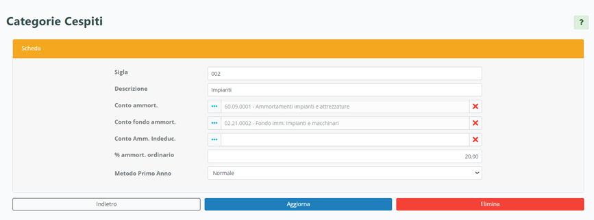 Un altro parametro obbligatorio sono le Categorie Cespiti in cui sarà possibile imputare i conti economici e patrimoniali al fine di effettuare il corretto calcolo d’ammortamento.