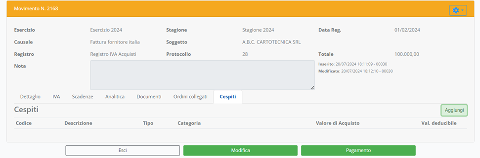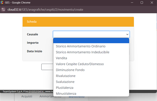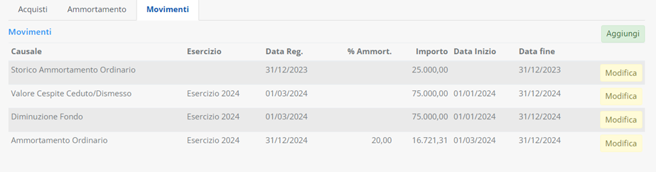 Infine, nella sezione “Movimenti”, cliccando sul pulsante “Aggiungi” è possibile inserire oltre allo storico, ulteriori operazioni del cespite che possono presentarsi nel corso della gestione dei cespiti (diminuzione del fondo, cessione, dismissione del cespite, svalutazione o rivalutazione, …).
