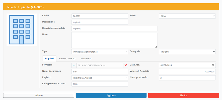 Nel caso in cui il cespite venga registrato dalla fattura d’acquisto, i dati verranno riportati in automatico.
