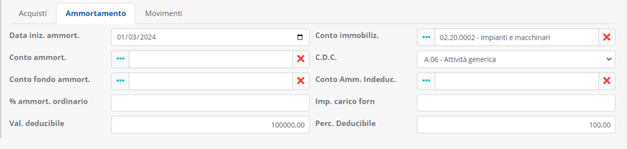 Successivamente, si aprirà una maschera più ampia con tre sezioni che vi consentirà di inserire ulteriori informazioni del cespite ai fini del calcolo dell’ammortamento.