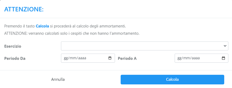 Cliccando nella funzione “Calcola Ammortamenti” potrete inserire l’esercizio per cui state calcolando l’ammortamento dei cespiti.