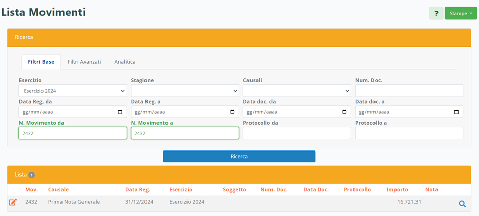 Dopo aver premuto il pulsante “Registra”, troverete il movimento contabile nella vostra Lista Movimenti.