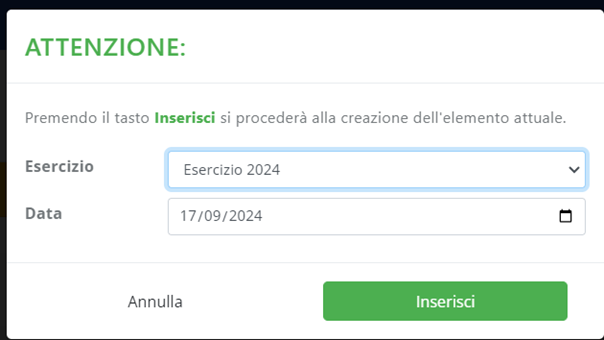 Cliccando sul pulsante “Nuovo” potrete scegliere l’esercizio per cui desiderate elaborare il Registro e la data in cui volete gestirlo.