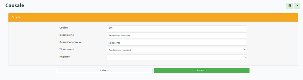 Per utilizzare la funzione "Distinte SEPA" è necessario prima di tutto creare l'apposita Causale dal menu Società>Causali cliccando il pulsante "Nuovo" in alto a destra. Compilare la maschera come segue: