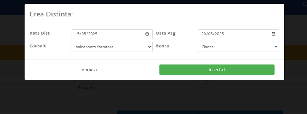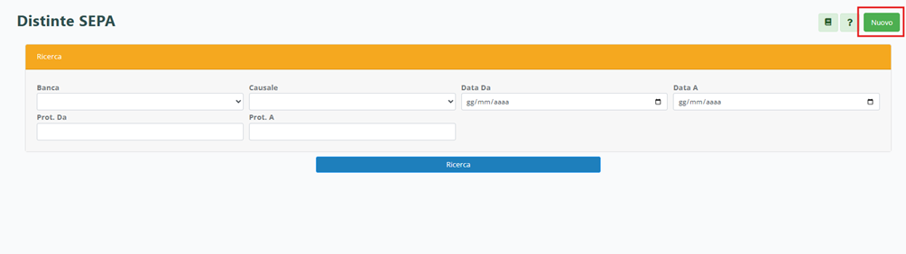Entrando nel menu Contabilità>Distinte SEPA, è possibile cliccare in alto a destra sul pulsante “Nuovo” per generare una nuova distinta.