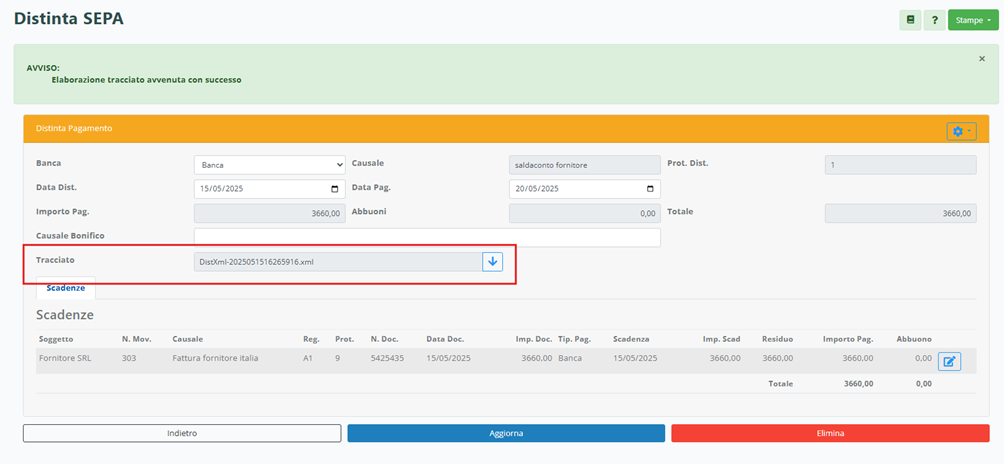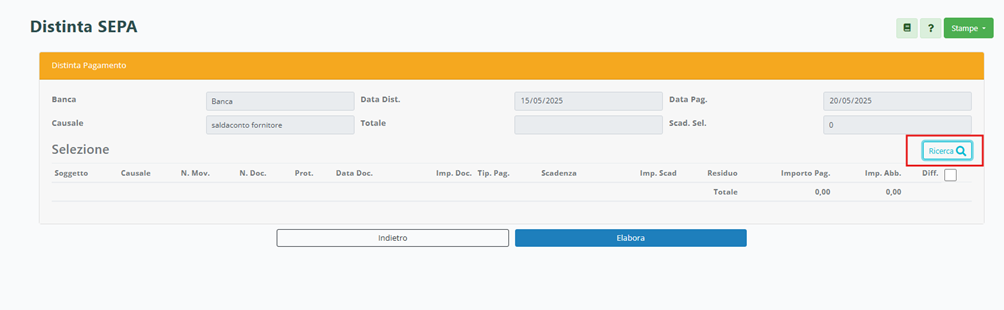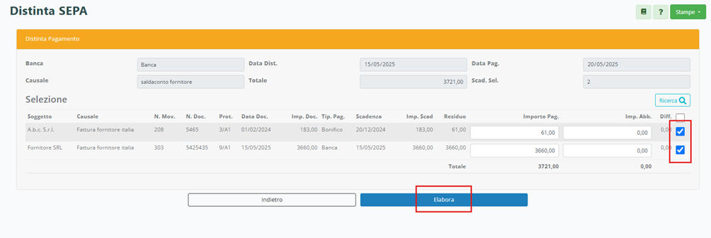 Nella schermata successiva compariranno tutte le Fatture che non risultano ancora pagate e per le quali è stata gestita una Modalità di pagamento. È possibile selezionare una o più scadenze e cliccare “Elabora”:
