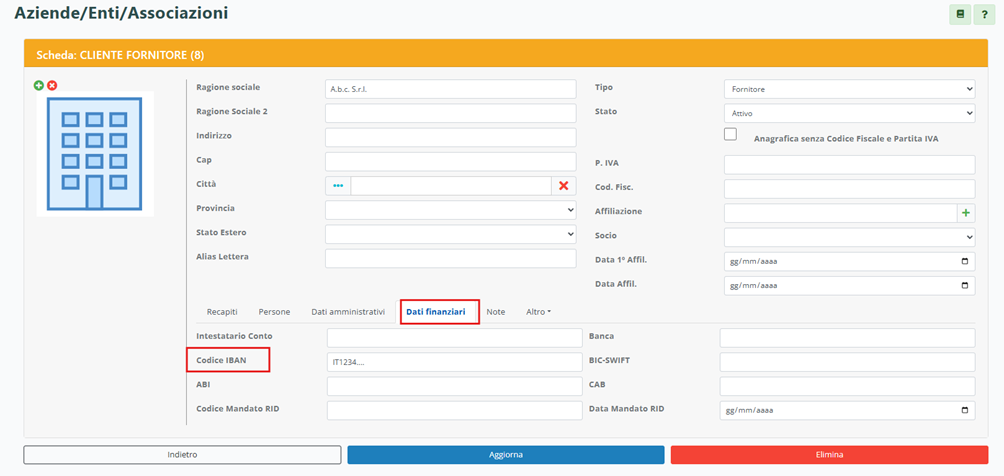 Nell’anagrafica del fornitore (menu Anagrafiche>Aziende/Enti/Associazioni), oltre ai dati anagrafici, è necessario che venga compilato il campo “IBAN” presente all’interno della palettina “Dati Finanziari”: