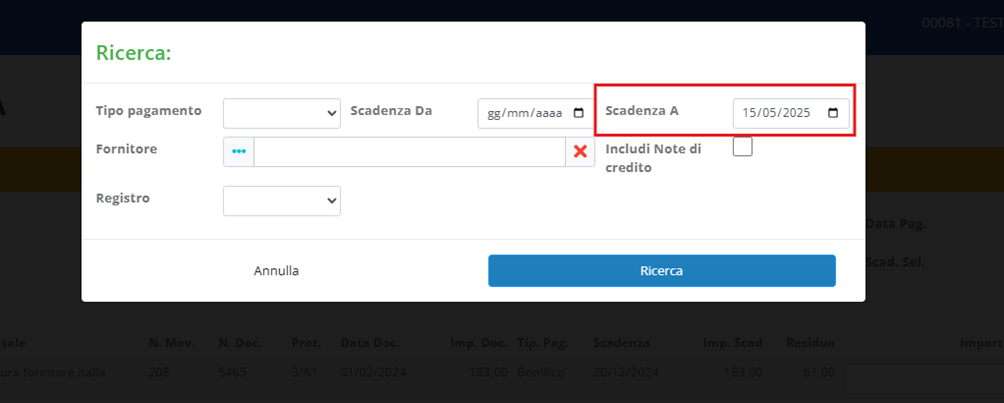 Cliccando il pulsante “Ricerca” sarà possibile impostare dei filtri di ricerca (esempio “Scadenza a 15/05/2025” per visualizzare le scadenze aperte: