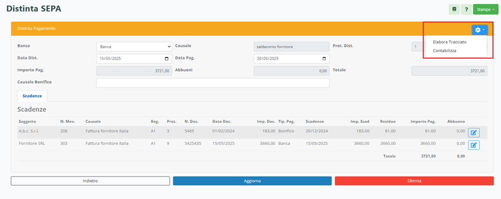 Infine, cliccando in alto a destra sull’ingranaggio blu sarà possibile Elaborare il tracciato xml e contabilizzare la Distinta:
