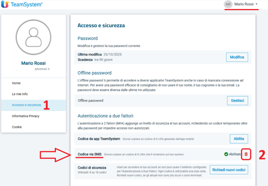 Cliccare sull’icona del cestino posta accanto al metodo ‘Codice via SMS’ per eliminare il numero attualmente associato