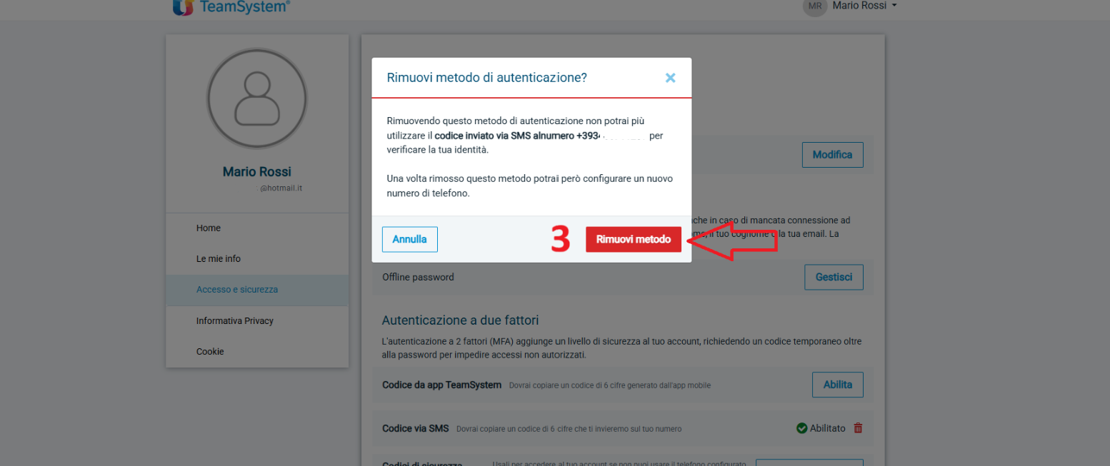 Nella finestra pop-up che comparirà, conferma l’operazione cliccando sul pulsante ‘Rimuovi metodo’