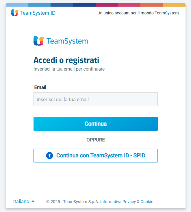 - Entrare nel sito TS ID (https://identity.teamsystem.com/) e accedere con la mail e password collegata al TS ID e che utilizzate solitamente per accedere ai nostri gestionali: